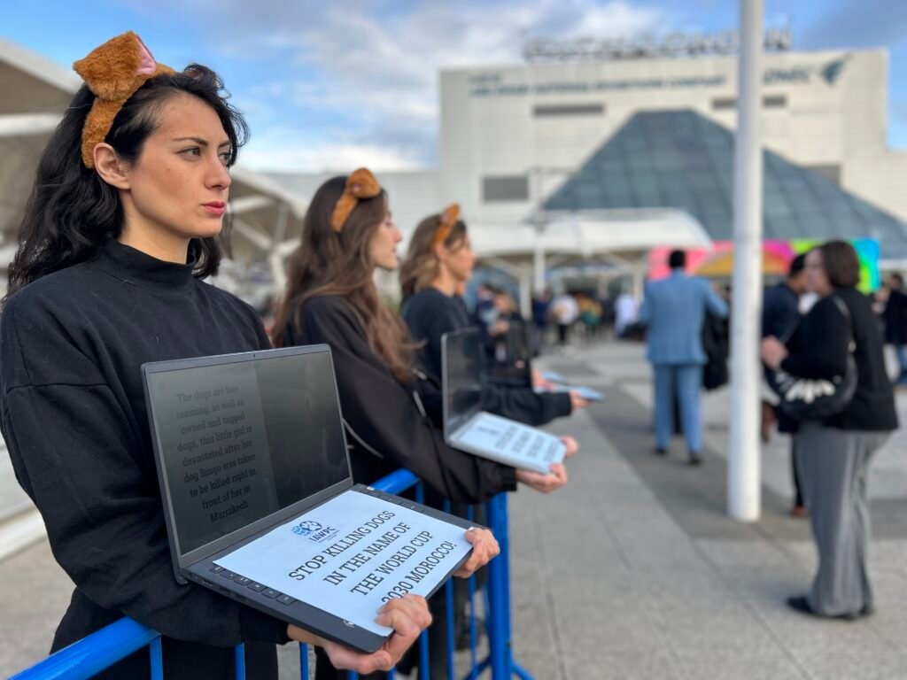 A hard-hitting protest took place outside the World Travel Market at London’s ExCeL Centre yesterday, as campaigners from the International Animal Welfare Protection Coalition (IAWPC) joined forces with member charity PETA to expose the mass killing of dogs in Morocco ahead of the 2030 FIFA World Cup.