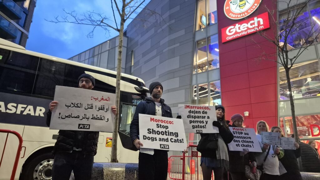 The International Animal Welfare Protection Coalition (IAWPC) joined activists from PETA for a peaceful outreach event, handing out flyers, QR-code petitions and holding banners demanding Morocco halt the killing of an estimated three million free-roaming dogs ahead of the 2030 FIFA World Cup, which Morocco will co-host with Spain and Portugal.